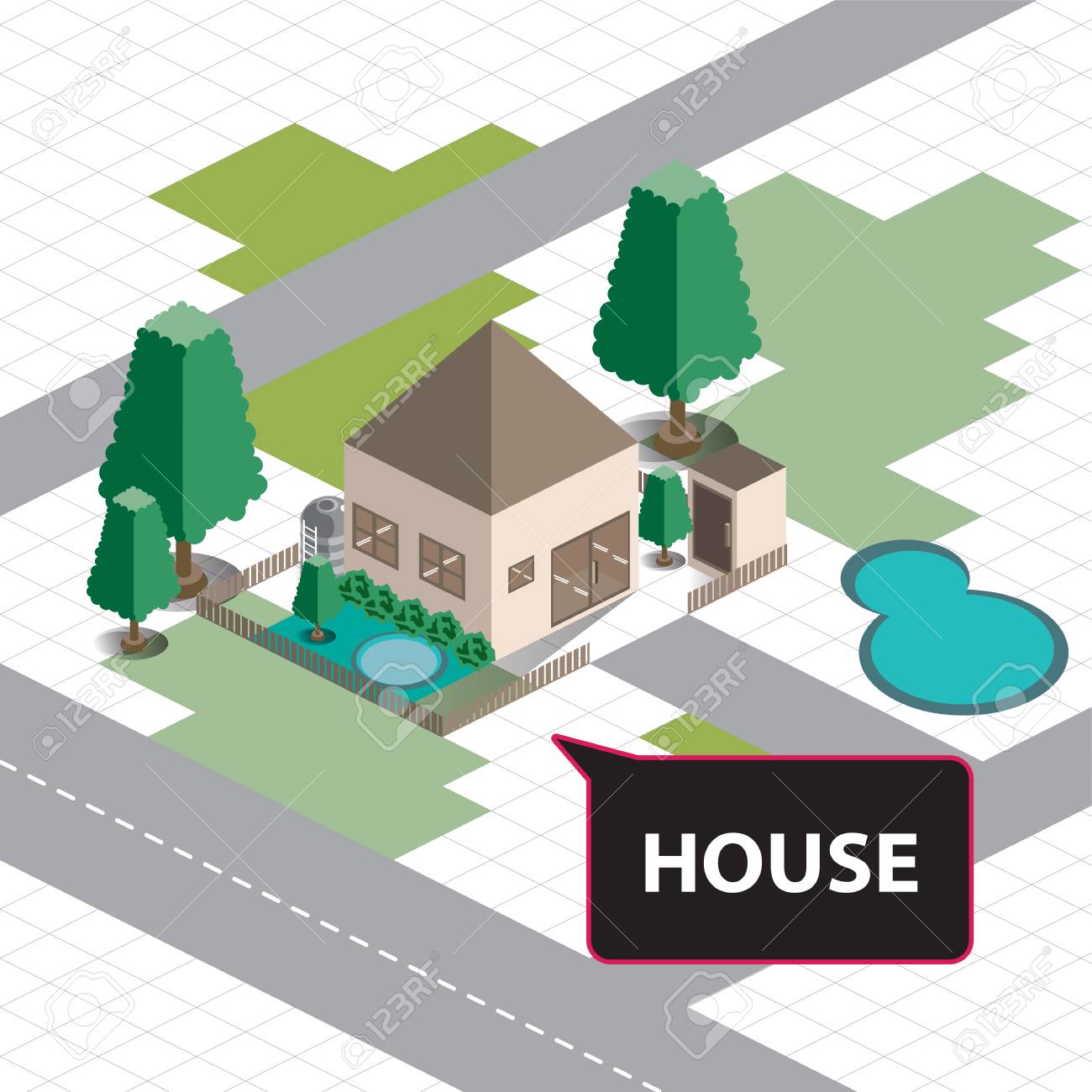 Isometric House Building Village Apartment Hotel Map Stock