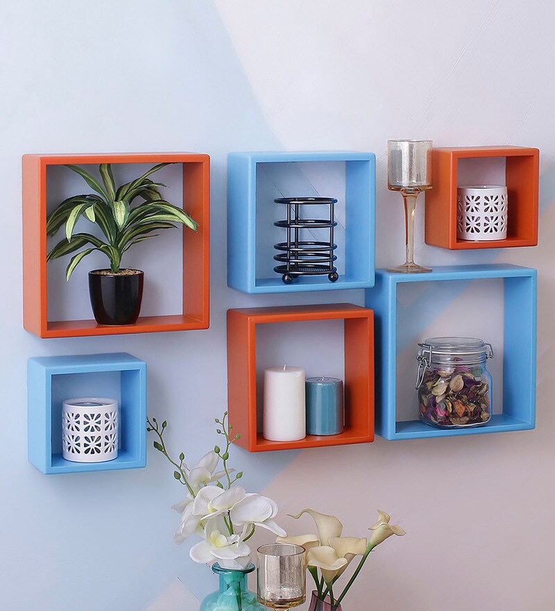 Buy Set Of 6 Engineered Wood Square Wall Shelf In Blue Orange