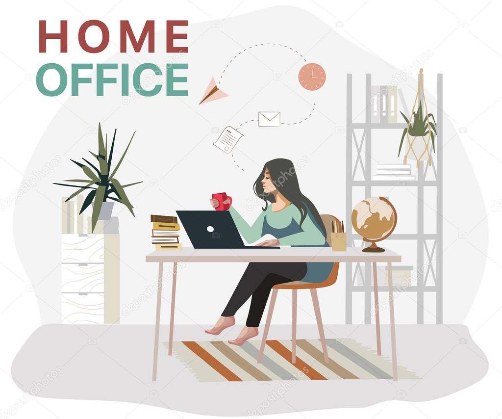 Girl Freelancer Vector Illustration Flat Design Work Home Computer